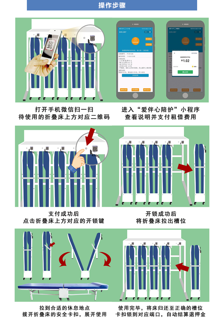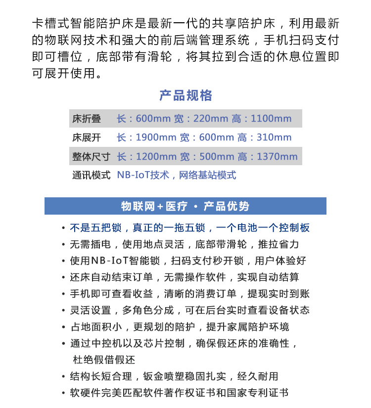 卡槽式陪护床,一拖五陪护床,RFID专利防假还床,一个卡槽配一个识别标签,杜绝假还床