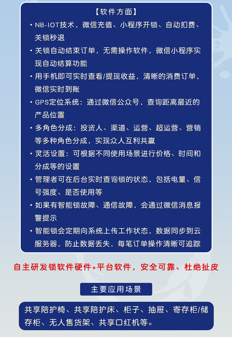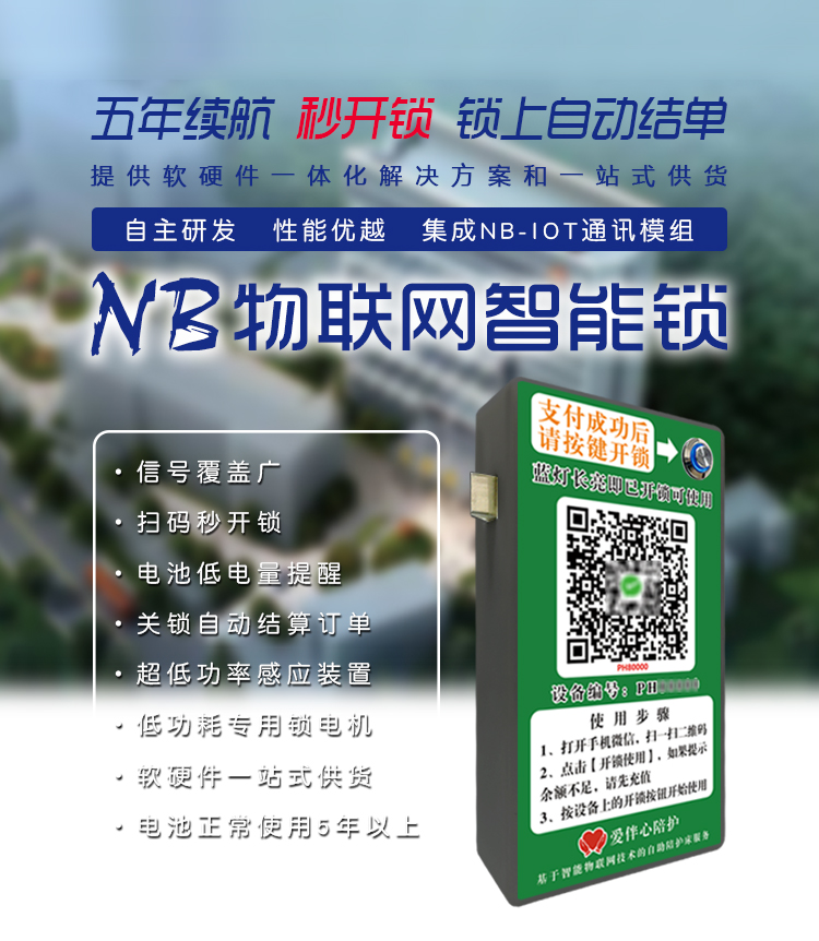 采用NB-IoT技术,信号覆盖广,穿透力强,数据传输更加快捷、稳定、精确; 无需下载安装APP,使用微信扫码秒开锁,用户体验超好; 关上陪护床柜门或者合上陪护床椅,自动上锁,自动结算